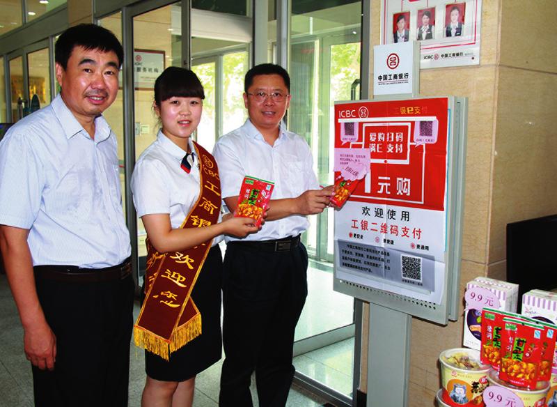 7月29日—12月31日,工行山东省临沂分行在全辖开展“二维码支付1元购”活动,客户在营业网点使用“融e联”扫商户二维码可享受购买10元以上商品立减9元的优惠。图为该行副行长魏宗杰(右一)在市中支行营业部体验扫码并向客户介绍该业务。梁克水摄影报道