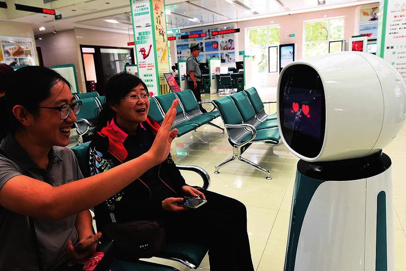 9月26日,一智能机器人在农业银行山东省潍坊青州市支行营业部大厅正式上岗。这个智能机器人身高115cm,造型可爱,憨态可掬,承担了“大堂经理”的角色,可以通过语言识别、触摸交互、肢体语言等方式,开展业务引导、业务查询等服务。另外还能说学逗唱,萌态十足,大大增强了服务的科技含量和趣味性。CFP供图