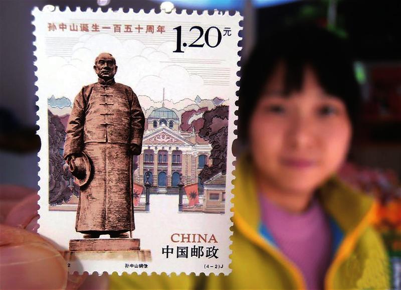 11月12日,中国邮政发行《孙中山诞生一百五十周年》纪念邮票1套4枚。邮票图案内容分别为:孙中山故居纪念馆、孙中山铜像、中山公园中山堂、中山纪念中学,全套邮票面值5.40元。2016年11月12日,一名集邮爱好者在江苏苏州邮政局展示《孙中山诞生一百五十周年》纪念邮票之“孙中山铜像”。新华社供图