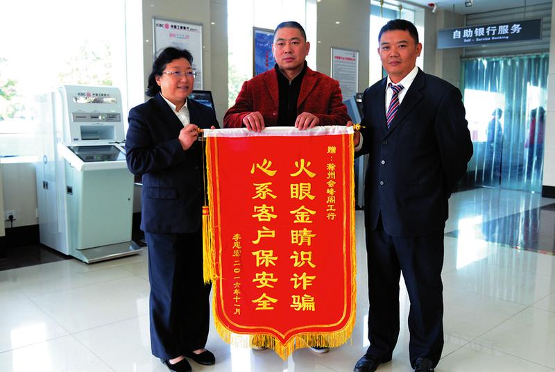日前,工行安徽省滁州市会峰阁支行拦截一起电信网络诈骗,为客户李某避免了8500元的损失。图为李某到网点送上“火眼金睛识诈骗、心系客户保安全”的锦旗表示感谢。千河摄影报道