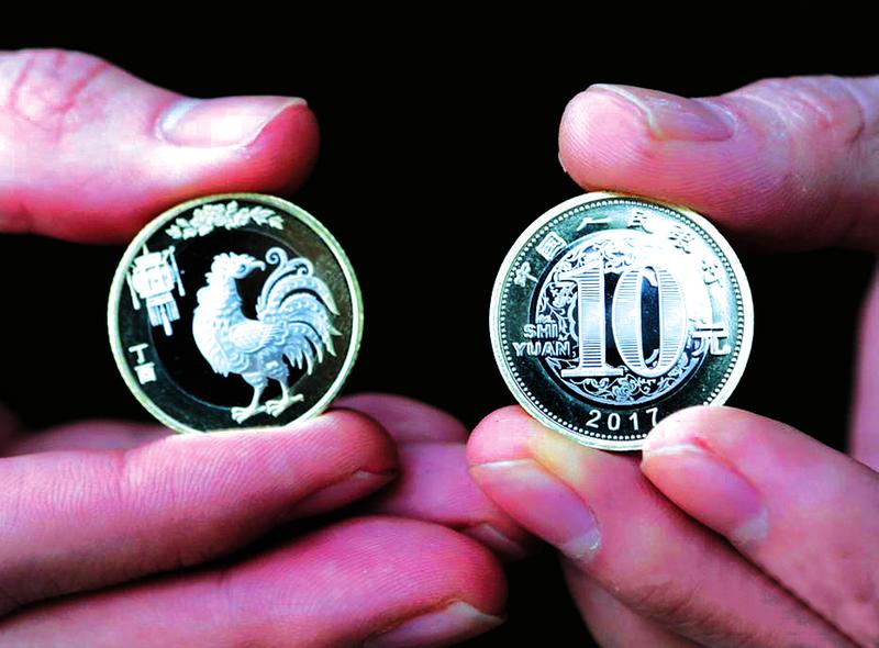 1月4日,一名北京市民展示刚刚兑换到的鸡年贺岁纪念币。据悉,中国人民银行发行的2017年双色铜合金纪念币,正面图案为“中国人民银行”、10元”字样、汉语拼音字母“SHIYUAN”及年号“2017”,底纹衬以团花图案。中新社供图
