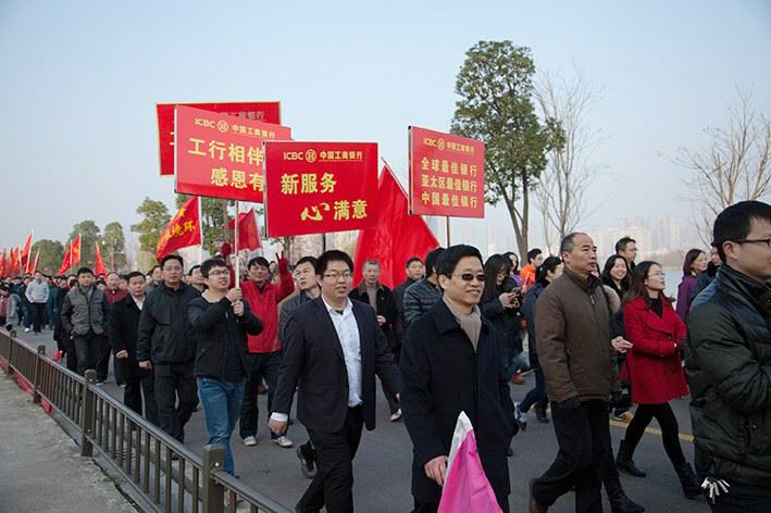 2016年12月31日,工行湖北省黄冈分行160余名干部、员工,参加了黄冈市“环遗爱湖万人迎春健步行”活动。员工们举着“相伴工行、共创辉煌”、“新服务、心满意”等宣传牌行进在队伍中,展示了工行员工昂扬向上的精神风貌。耿明 熊钢    摄影报道