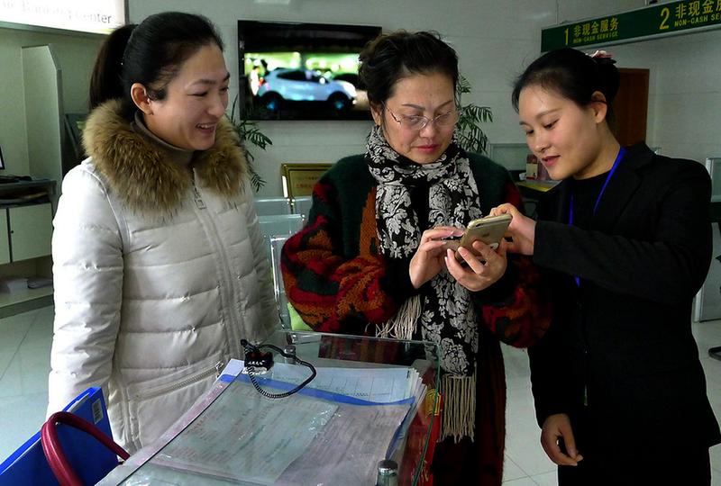 新年伊始,邮储银行安徽省滁州分行针对客户的理财偏好和风险承受能力等,积极做好理财产品的宣传与营销,成效显著。图为该行营业部大堂经理(右一)指导客户利用手机购买理财产品。千河摄影报道