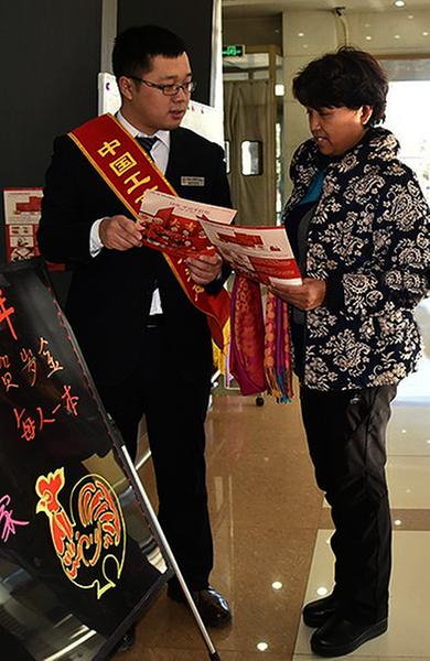 工行辽宁省朝阳分行在岁末年初之际,积极开展《工银贺岁金·大吉年红包》宣传营销活动,并取得好成果。图为近日该行龙城支行营业室大堂经理向客户宣传推介工银贺岁金产品。