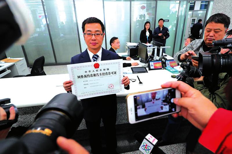 2月8日,首约科技(北京)有限公司CEO魏东在北京展示领取到的网络预约出租车经营许可证。当日,已通过交通、公安、通信、网信、地税、国税、人民银行等单位联合审核的首约科技(北京)有限公司获得网络预约出租车经营许可证,这是北京市正式发放的首个省一级网约车平台经营许可证。新华社供图