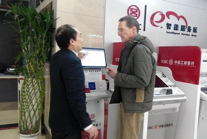 近日,通晓英语并曾荣获工行湖南省永州分行“优质文明服务先进个人”的工行零陵支行员工李治平(左),耐心指导湖南科技学院外籍教师、德国人恩斯特先生,成功办理了2张借记芯片卡换卡不换号和登录密码重置业务,受到恩斯特的称赞。唐群李勰摄影报道