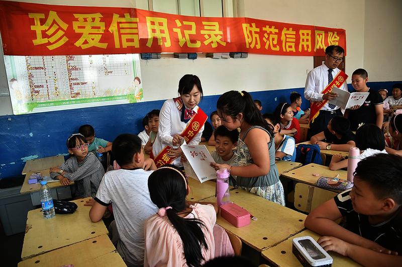 6月14日是全国第十个“信用记录关爱日”。工行辽宁省朝阳分行制定走进校园活动方案,大力开展宣传活动,让征信从孩子做起。同时,该行各营业网点以悬挂征信宣传口号横幅、张贴宣传海报、摆放征信宣传折页、电子屏幕滚动播出征信口号等宣传方式,开展征信宣传。图为该行员工在朝阳市光明小学五年级三班宣传讲解“征信”知识。王建国