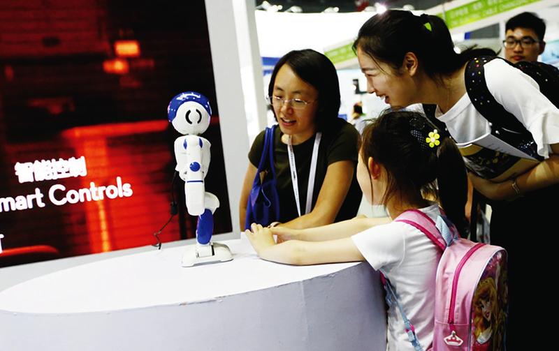 7月6日,第6届中国国际机器人展览会在上海国家会展中心举行,来自美国、德国、意大利等13个国家和地区的368家企业参展,各类居家智能机器人和工业自动化机器人等在展会上与观众近距离接触。图为参观者在体验一款可以放在床头进行互动交流的小机器人。新华社供图