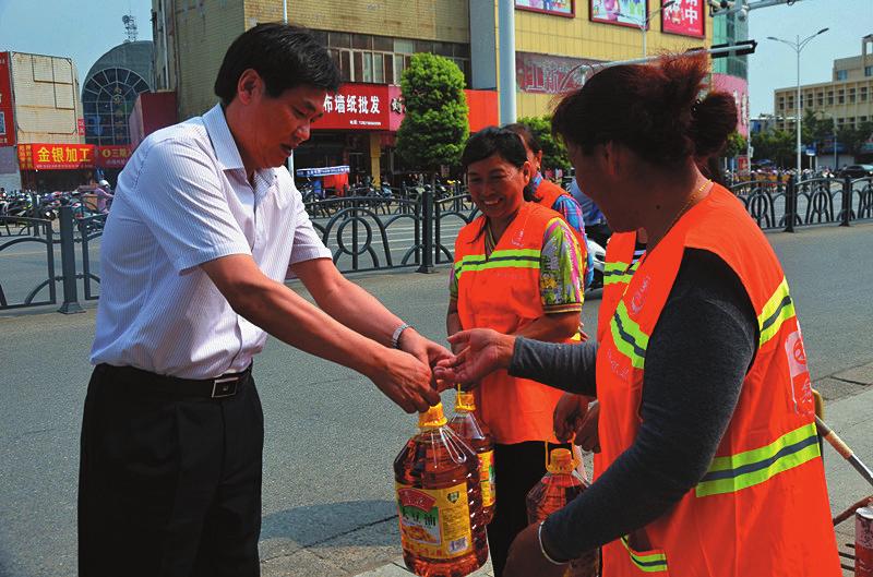 近日,江苏省射阳农商银行董事长臧正志带领该行班子成员顶着炎炎烈日,分别来到县城解放路蔬果超市、达阳南路文化惠民广场等地段,亲切慰问冒着酷暑奋战在公路一线的环卫工人,并向每人送去价值200元的矿泉水、大米、色拉油等慰问品。据了解,该行这次活动共慰问环卫工人608人,慰问品价值12.16万元。图为臧正志(左一)慰问环卫工人。陈军张建忠摄影报道
