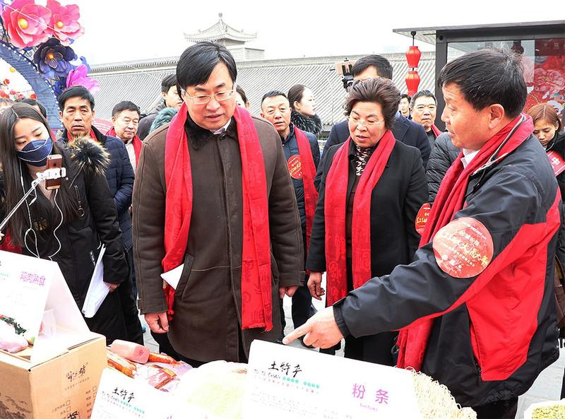 据了解,工行陕西分行近年来扎实开展“两联一包、驻村联户”定点扶贫工作,通过开展产业扶贫、扶持家庭养殖、结对子、支持外出创业等措施,对83个扶贫点3600余个贫困户开展扶贫工作,派出驻村第一书记24人。同时,还充分发挥电商扶贫优势,积极探索新型金融扶贫模式。把工商银行“融e购”电子商务平台作为金融精准扶贫的重要抓手,积极构建“电商+政府/协会+企业+农户”模式,并在“融e购”平台先后开展“中国洛川苹果融e购节”“陕西有机富硒春茶节”等活动,帮助贫困地区扩大农产品销售,依托互联网加快脱贫步伐。该行还按照“公司+合作社+基地+贫困户”的经营模式,重点围绕陕南茶产业集群、陕北果业集群等特色产业,因地制宜地创新设计了“茶业通”“果业通”等个性化融资方案,金融支持贫困地区企业发展,带动当地困难群众脱贫致富。截至2017年末,该行在陕西省56个国家级贫困县的各项贷款余额228.53亿元,其中11个深度贫困县贷款余额75.1亿元,较上年增长26.8%;建档立卡的8401个贫困户贷款余额15.62亿元,较上年增长108.27%。图为工行陕西分行行长高志新(中)了解扶贫企业农产品的销售情况。