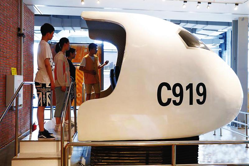 6月27日,哈尔滨“创新决胜未来”科普展开幕,本次展览注重互动性和体验性,让游客有机会近距离了解中国近年来在航空航天、深海探测、信息通讯等科技领域取得的重大成就。图为游客参观C919客机模拟驾驶舱。中新社供图