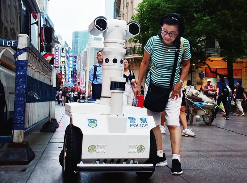 上海首位机器人警察近日正式上岗巡逻,引来不少路人游客的好奇观看。这位机器人警察学名警用巡逻机器人,它搭载了4路广角高清摄像机、路红外热成像及1路变焦高清摄像机,实现全景无死角巡逻。除此之外,机器人还可以根据不同场景播放不同的防范宣传内容,搭载5G网络实现现场图像的实时传送。新华社供图