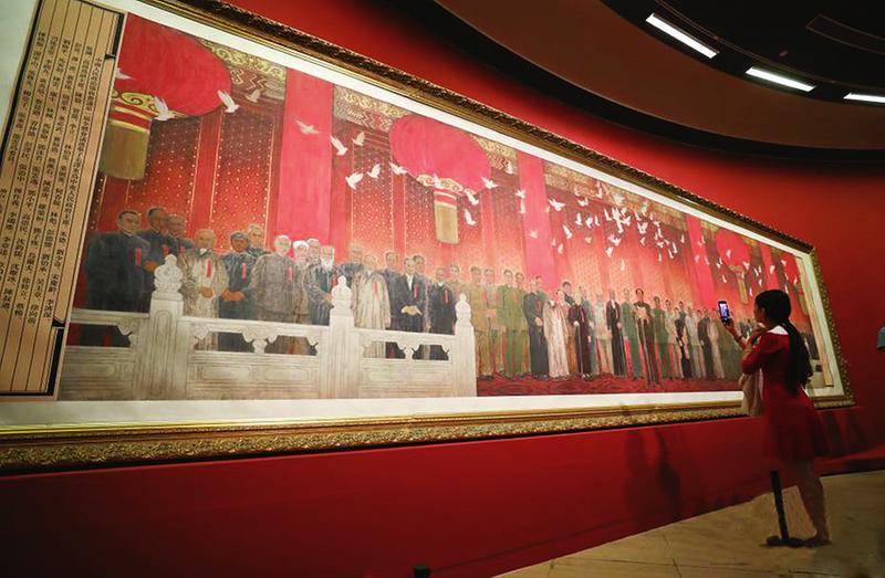 9月26日,“伟大历程壮丽画卷——庆祝中华人民共和国成立70周年美术作品展”在北京的中国美术馆举办。此次展览总计展出作品480余件,重点遴选了一批新中国成立以来不同时期反映现实题材的作品,汇集国内20余个重要美术馆的经典藏品,几乎囊括了新中国成立以来所有的经典之作。图为中国画《新中国诞生》。