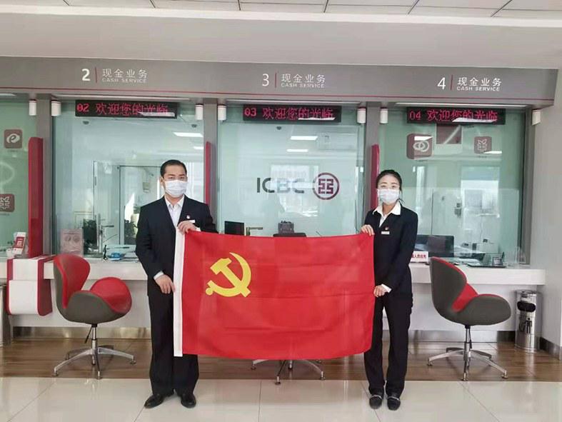 面对新冠肺炎严峻疫情,工行河北省沧州市盐山支行充分发挥党的基层组织和党员作用,营业网点党支部优先安排党员迎难而上盯班值守,开展把党旗、党徽、党员身份亮出来活动,党员冲在一线,奋战在一线,“让党旗在防控疫情斗争第一线高高飘扬”。殷承志摄影报道