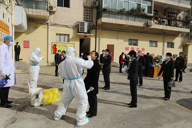 为进一步做好新冠肺炎疫情防控工作,4月22日,农行湖北省荆门市钟祥支行专门从市人民医院请来医护人员,对全辖员工进行核酸检测,做到不留隐患、健康上岗,为创造安全的业务环境和确保员工健康安全提供保障。图为核酸检测现场。姚世清摄影报道