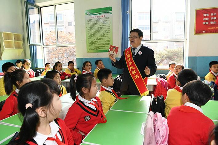 图为王建国在朝阳市双塔区西街雷锋小学参加三年级一班开展的“学雷锋做好少年”主题班会,讲述雷锋小时候帮助同学上进、助人为乐的故事。