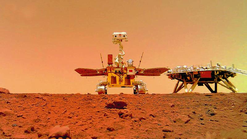 日前,国家航天局公布了由祝融号火星车拍摄的着陆点全景、火星地形地貌、“中国印迹”和“着巡合影”等影像图。首批科学影像图的发布,标志着我国首次火星探测任务取得圆满成功。图为“着巡合影”图。新华社供图
