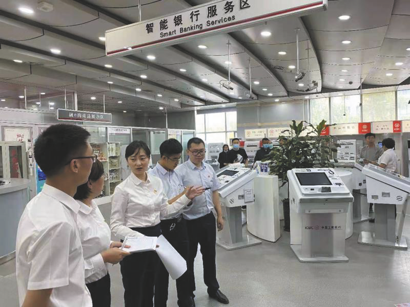 大庆分行发扬大庆精神,践行“人民金融”理念,积极推进“第一个人金融银行”战略,有效提升了金融服务品质,备受百姓大众好评。图为该行分管个金业务的副行长王黎(左三)带领客户经理团队,深入基层网点与一线员工共同商讨如何进一步搞好智能服务,促进个金业务高质量可持续发展。