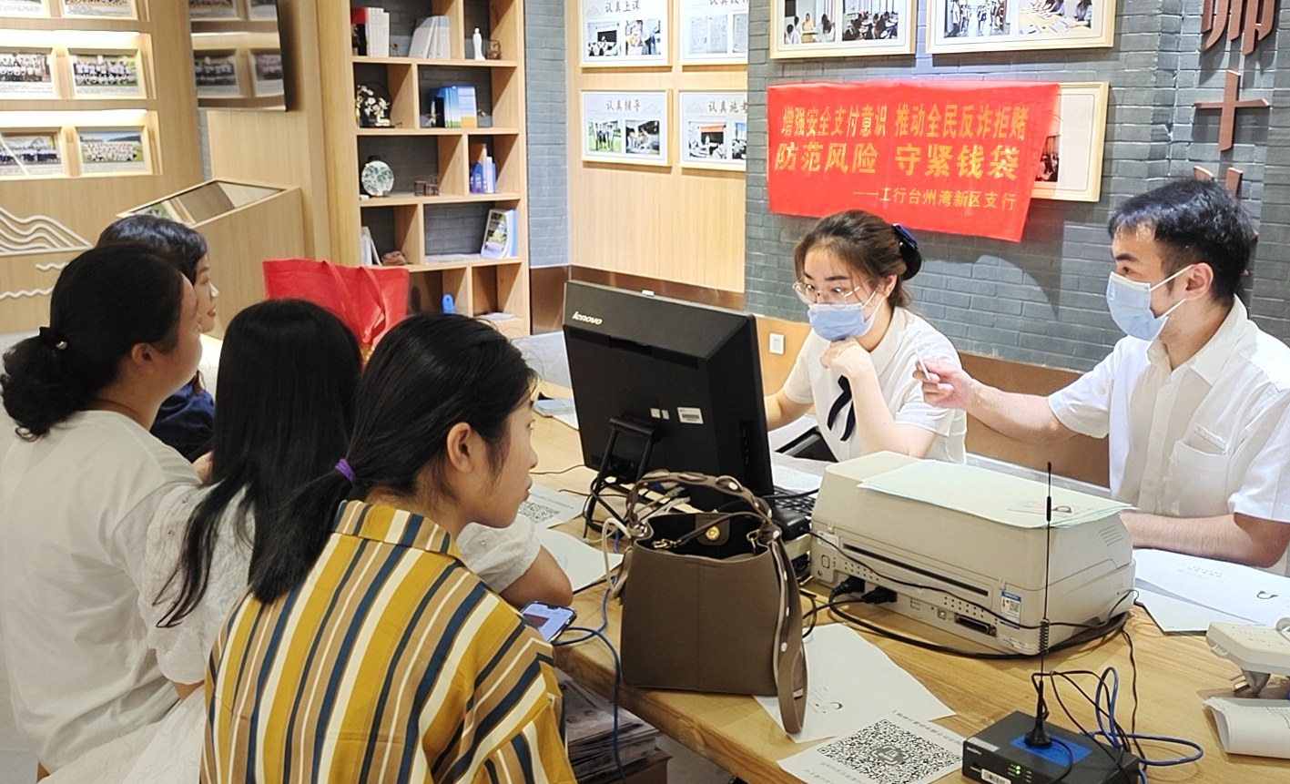 为进一步扩展反诈拒赌宣传的覆盖范围,提高客户的风险防范意识,切实维护人民群众的财产安全,近期,工行浙江省台州湾新区支行工作人员借助为学校、企业客户上门办理代发工资卡的契机,走进学校、建筑公司开展了一系列反诈拒赌宣传活动。 张微 摄影报道