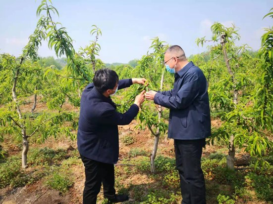 江苏盱眙农商银行副行长单成刚(右)到盱眙祥盛中药材及果树种植家庭农场,向该农场负责人阮新祥详细了解中草药、果树病虫害防治及生产经营信贷需求情况。 刘志安 摄影报道