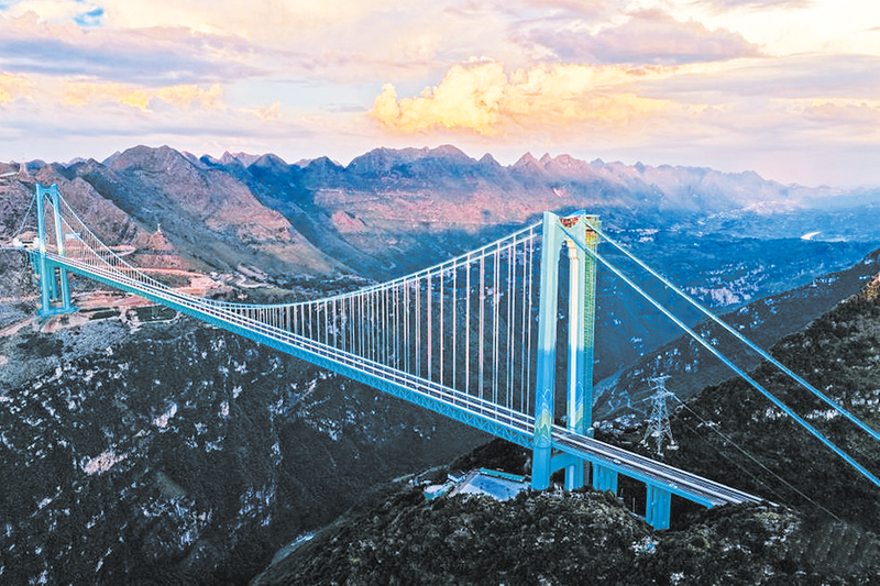 近日,横跨贵州省贞丰县与关岭县的世界第一高桥——六安高速花江峡谷大桥正式建成通车。花江峡谷大桥是贵州六枝至安龙高速公路的控制性工程,大桥全长2890米,主跨1420米,是目前世界山区峡谷第一大跨度钢桁梁悬索桥;其桥面距水面垂直高度625米,超越北盘江第一桥成为新的世界第一高桥,被誉为“横竖都是第一”。图为夕阳下的贵州花江峡谷大桥。 新华社供图