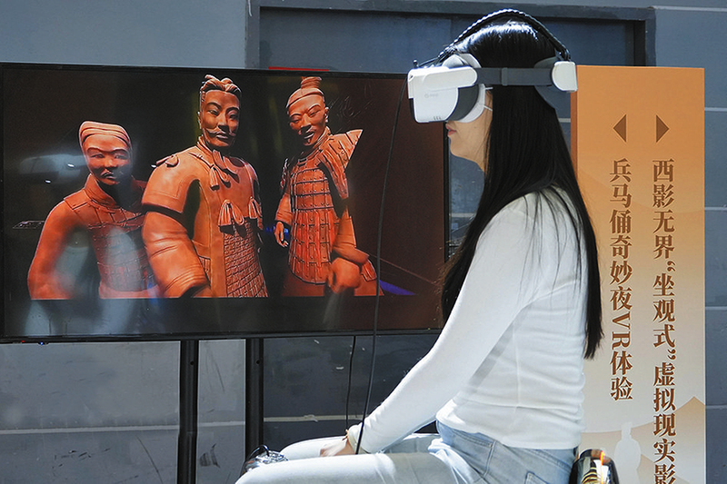 日前,以“数智引领未来,版权创新发展”为主题的第十届中国国际版权博览会在山东青岛举行。本届版博会共吸引57个展团、超1100家企业参展,集中展示全球版权领域数字化、智能化创新成果,高水平搭建了版权产品和服务展览交易国际化平台。图为参观者佩戴可穿戴式VR设备观展。 人民网供图