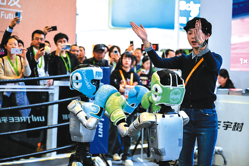 日前,在第八届进博会技术装备展区宇树科技展台,两台G1人形机器人的格斗表演吸引了众多观众。它们戴着护具及拳套,施展直拳、勾拳、左右鞭腿,展示倒地自主起身等复杂动作,不时赢得观众喝彩。据了解,这款亮相表演的人形机器人身高132厘米,体重约35公斤。图为裁判宣布人形机器人格斗开始。