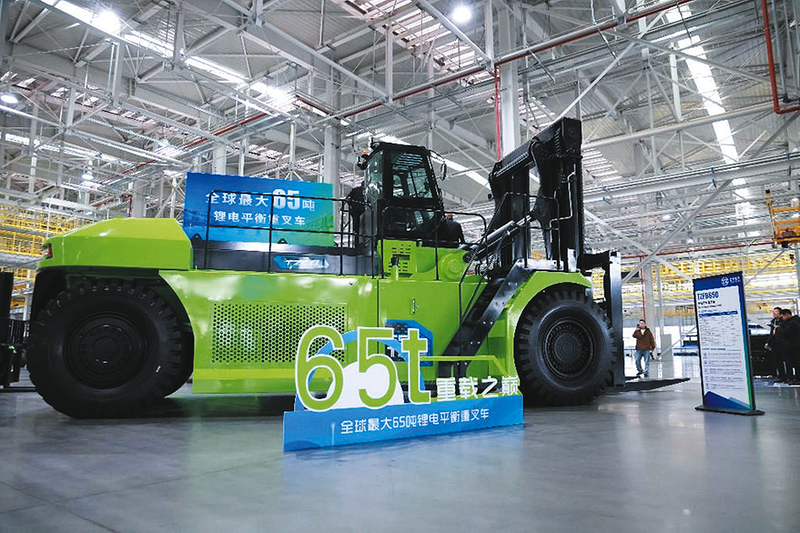 近日,太原重型机械集团有限公司研发的全球最大65吨级锂电平衡重叉车正式下线。该车突破锂电平衡重叉车搬运重量极限,是工业车辆领域中的“巨无霸”和“技术标杆”,代表了重载搬运电气化的最高水平。图为65吨级锂电平衡重叉车。