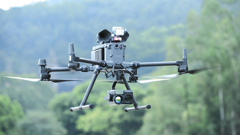 无人机搭载成至智能公司的喊话器、探照灯、热成像相机,执行空中搜救任务。