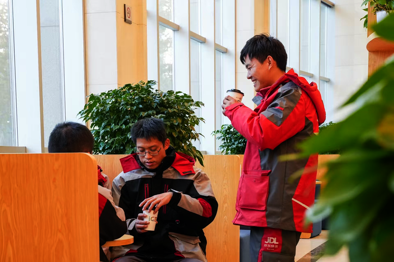 快递小哥到“邯郸新驿”歇脚充电,开心交谈。
