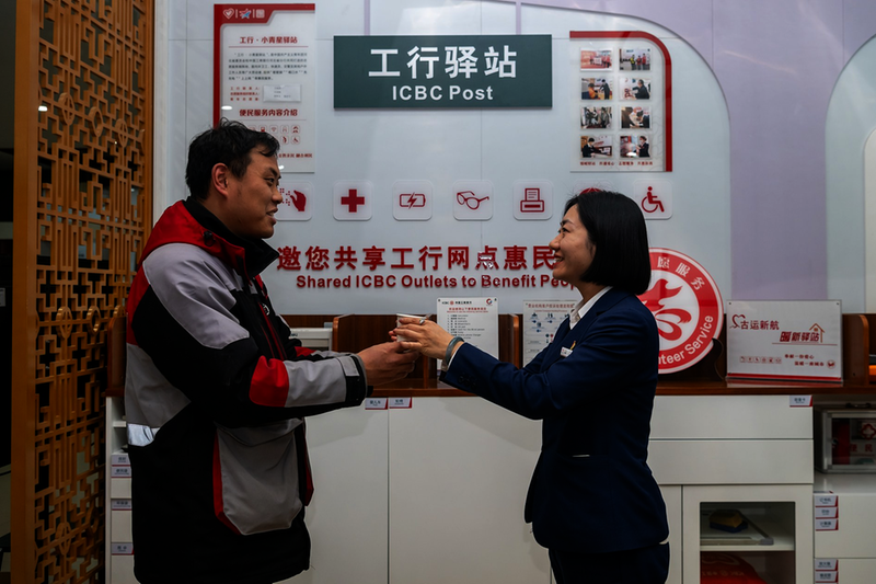 2025年12月30日,工商银行河北省沧州市车站支行员工在“暖新驿站”里,为快递小哥提供“暖心服务”。据悉,“暖新驿站”由沧州分行与沧州市委社工部联合设立,旨在打造为快递员、城市美容师等户外工作者提供歇脚、充电、热饭等社会公益服务的场所。 陈春雷 摄影报道