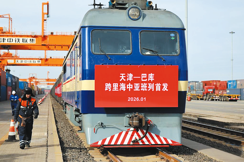 近日,一列满载不锈钢管材、家电等货物的中亚班列从中国铁路北京局集团有限公司所属的天津集装箱中心站驶出,将经由霍尔果斯口岸出境至哈萨克斯坦阿克套港,最终经里海海运至阿塞拜疆巴库。据了解,该趟列车是天津开行的首趟至巴库跨里海中亚班列,为天津与阿塞拜疆、哈萨克斯坦等国家互联互通增添了稳定快捷的货运新通道。图为天津—巴库跨里海中亚班列首发现场。