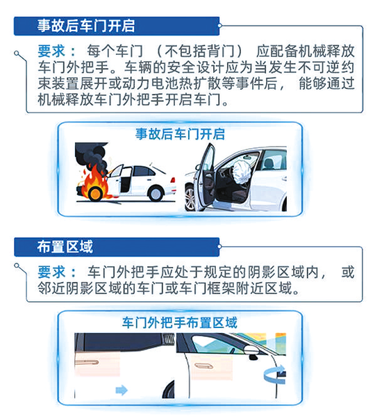@新浪财经 日前,工信部组织制定的强制性国家标准《汽车车门把手安全技术要求》(GB 48001—2026)由国家市场监督管理总局、国家标准化管理委员会批准发布,将于2027年1月1日起实施,风靡一时的全隐藏式门把手将逐步退出市场。该标准核心为解决隐藏式、电子式门把手流行带来的安全隐患。目前,隐藏式门把手已成为车企打造车型科技感的标配,2025年4月国内销量前100的新能源车型中,约六成配备该设计,车企称其可降低风阻、提升视觉一体化效果,但车辆碰撞断电时,门把手易失灵,存在救援难题。新国标设置梯度过渡期:新申请批准车型自2027年1月1日起需满足除“手部操作空间”外全部要求,2028年1月1日起符合所有要求;已获批在售车型需在2029年1月1日前完成整改达标。