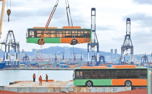 近日,100台出口墨西哥的天然气公交车在山东港口烟台港完成装船并启程。这批天然气公交车是安凯客车基于墨西哥市场需求研发的定制化产品,拥有更低气耗、更强动力和更长续航,将投入到墨西哥蒙特雷市的公共交通系统。图为出口墨西哥的天然气公交车在山东港口烟台港装船。新华社供图