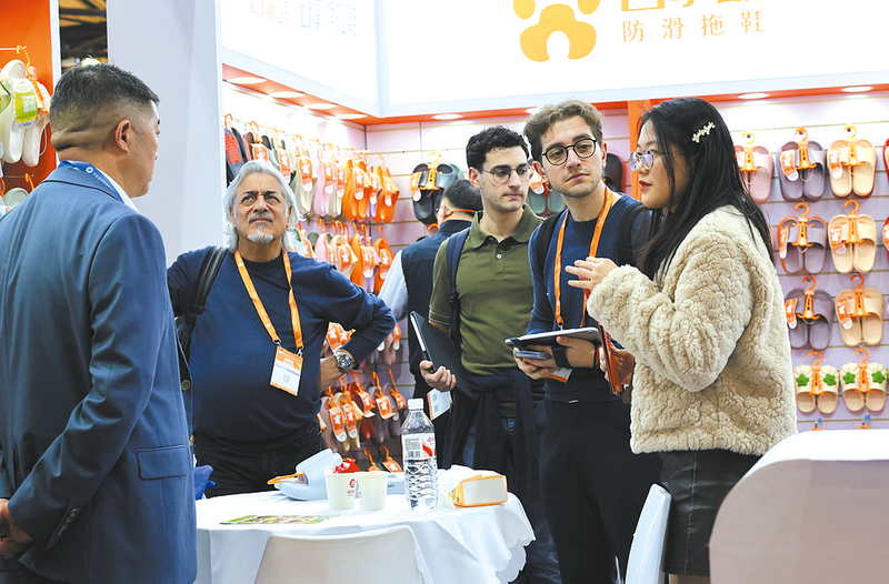 近日,第34届华东进出口商品交易会(以下简称“华交会”)在上海新国际博览中心开幕。作为中国外贸“新春第一展”,本届华交会展览总面积达11.5万平方米,覆盖上海新国际博览中心10个展馆。展会共设服装服饰展、纺织面料展、家庭用品展、装饰礼品展四大专业子展,以及跨境电商和境外展区两大专业展区。图为展商工作人员(右一)向采购商介绍产品信息。 新华社供图