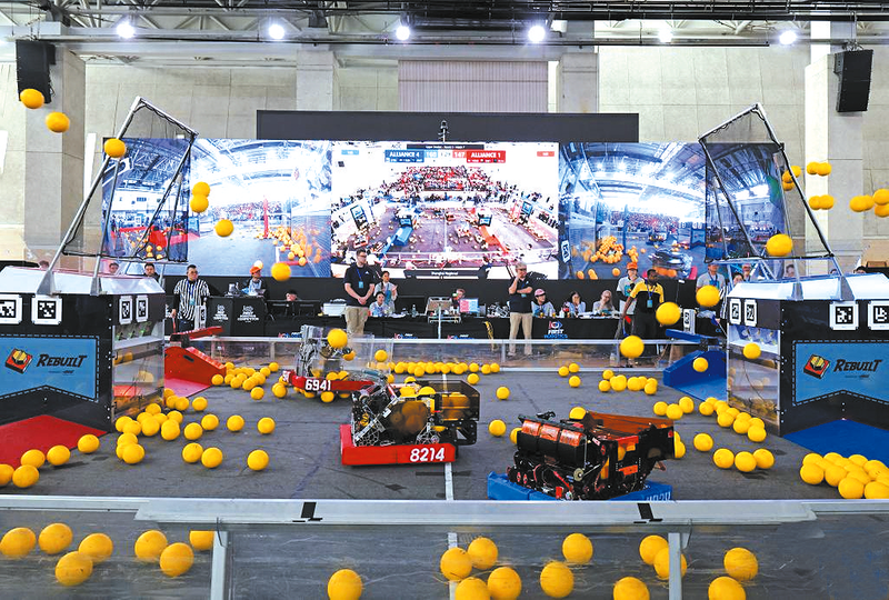 近日,2026FIRST机器人竞赛(FRC)上海国际区域赛在华东师范大学闵行校区正式开赛。来自国内外的50支参赛队伍、近千名青少年选手齐聚一堂、同台竞技,围绕“发掘重建”主题,展开了一场集科创实力与智慧创意于一体的机器人比拼,现场氛围热烈而紧张。图为机器人比赛现场。新华社供图