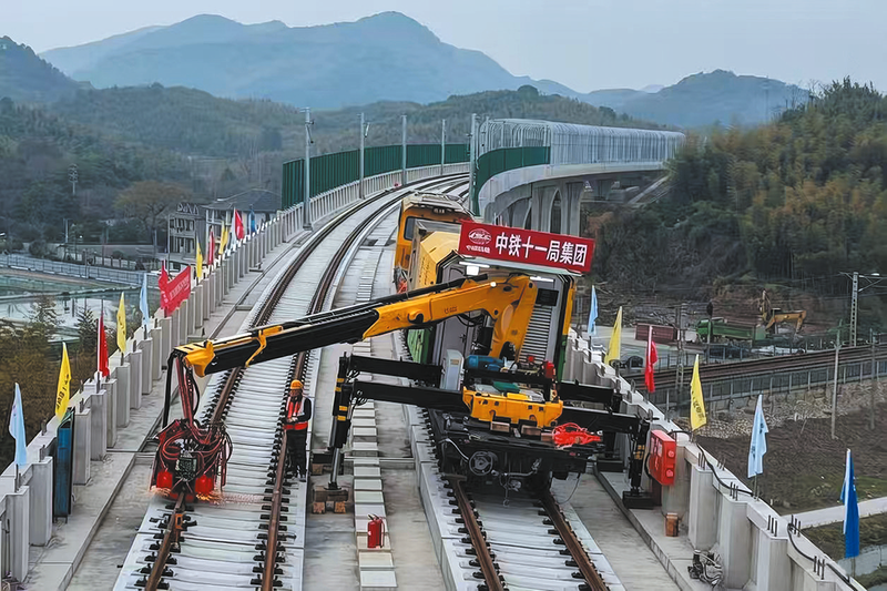 近日,在杭州至德清市域铁路施工现场,一款新能源多场景闪光焊轨机首次在钢轨上开展焊接作业。该设备采取了混合动力模式,搭载智能能源管理系统,支持“边充边焊”模式,在满电状态下可独立完成50个钢轨接头焊接,保障无外接电源区域连续稳定施工。此款智能装备采用“长臂吊”“窄机头”的设计方案,可应用于本线、邻线、线下、道岔等各类场景,具备“一机多场景、一机多功能”的优势,可以实现绿色低碳施工与高效作业,助力推进项目建设。图为中铁十一局技术人员操作新能源多场景闪光焊轨机开展焊接作业。 新华社供图