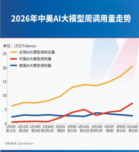 @中国经济网 全球最大AI模型API聚合平台OpenRouter最新数据显示,截至3月15日,中国AI大模型周调用量达4.69万亿Token(词元,是AI消化文字的最小单位),已连续两周超越美国,稳居全球首位。据了解,此次领跑更具里程碑意义,全球调用量前三席位被中国模型“清场式”包揽:MiniMaxM2.5以1.75万亿Token实现五连冠,阶跃星辰Step3.5Flash位居第二,DeepSeek V3.2以1.04万亿Token稳居第三;3月11日刚上线的Hunter Alpha,更以0.666万亿Token快速跻身全球第七。这一数据更迭,标志着全球AI产业已从“技术炫技”转向“商用落地”,中国大模型正凭借应用渗透与成本优势,重塑全球AI产业格局。