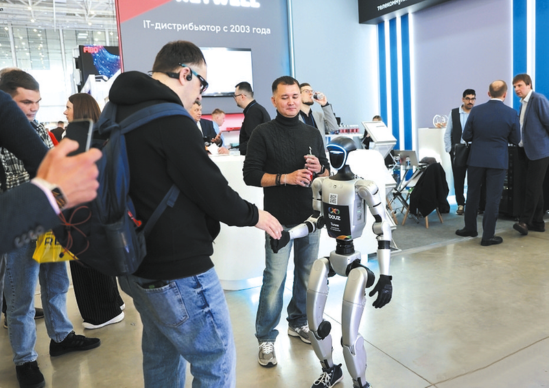 近日,第38届俄罗斯国际信息与通信技术展览会在莫斯科开幕。本届展会是2026年“俄罗斯高科技周”的一部分。该展会是俄罗斯、独联体及东欧地区规模最大的信息技术展会和专业平台,来自中国安徽、河北、广东、湖南、江苏、陕西、北京等省区市的众多企业参展。图为展览会上机器人与参观者互动。 中新社供图