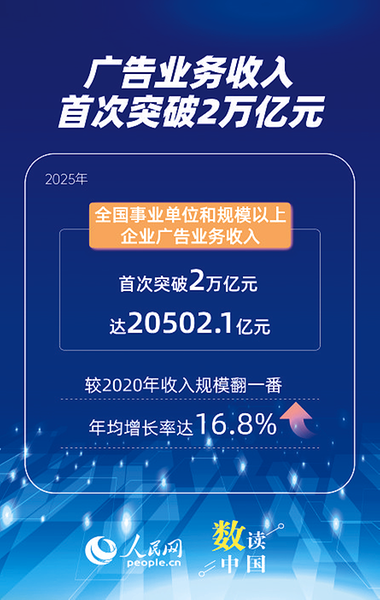 @人民网 据市场监管总局近日发布的数据,2025年,全国事业单位和规模以上企业广告业务收入首次突破2万亿元大关,达到20502.1亿元,较2020年实现“翻一番”,年均增长率16.8%。数据显示,2025年互联网广告业务收入达13574.3亿元,同比增长34.6%,占整体收入比重66.2%。与此同时,行业经营主体规模效益同步提升,收入超1亿元的经营主体超1400户,利税总额稳步增长,头部互联网平台广告业务收入增速超36.1%。区域发展呈现新态势,全国19个省份广告收入超百亿元,北京、上海、广东、浙江四省市合计收入14041.8亿元,占全国比重68.5%,较“十三五”期末下降5.5个百分点,区域梯次发展格局更趋平衡。