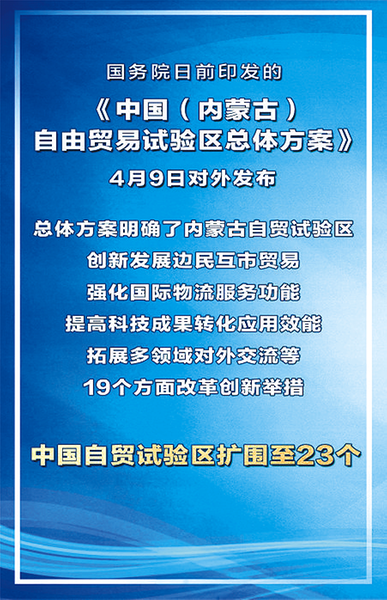 @证券日报 近日,国务院印发《中国(内蒙古)自由贸易试验区总体方案》,中国自贸试验区总数正式扩围至23个。作为“十五五”时期设立的首个自贸试验区,内蒙古自贸试验区填补了我国北部沿边自贸试验区布局空白,进一步完善了覆盖东西南北中、陆海统筹的全方位开放格局。据悉,内蒙古自贸试验区总面积达119.74平方公里,涵盖呼和浩特、满洲里、二连浩特三个片区。其中,呼和浩特片区76.28平方公里(含呼和浩特综合保税区0.88平方公里),重点发展战略性新兴产业、特色农牧产业及现代服务业;满洲里片区25.11平方公里(含满洲里综合保税区1.44平方公里),聚焦进口资源加工、跨境产业等;二连浩特片区18.35平方公里,主打国际贸易、物流等领域,三大片区各有侧重、协同发力,助力向北开放。